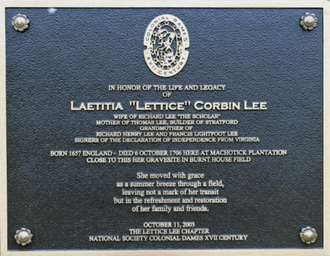 October 11, 2003: Lettice Lee Chapter honored their namesake by placing a plaque in her honor at the Hurn House Field Cemetery, Mt Pleasant Road (Rt. 675),
