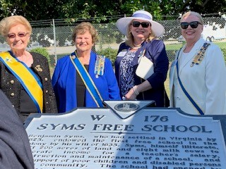 October 15, 2021: Virginia State Society dedicated a highway marker in recognition of Benjamin Syms who established the first free school in the colony in 1635. This was the culmination of a three year effort by Honorary State President Faye Sobel, completing her president’s project. The marker is posted near the entrance of the NASA Langley Research Center on Commander Shepard Boulevard, Hampton, VA.